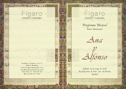 Tenemos a su disposición elegantes programas de imprenta (haga click en las imágenes de los programas para ampliarlos y ver todos los detalles) personalizados que podrá elegir entre varios modelos y se distribuirán entre los invitados.